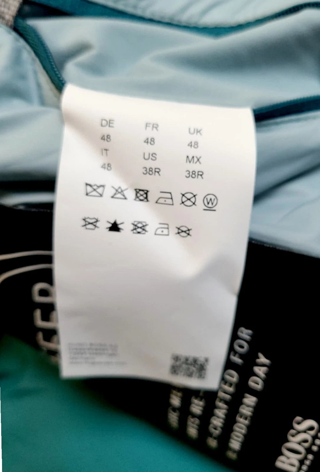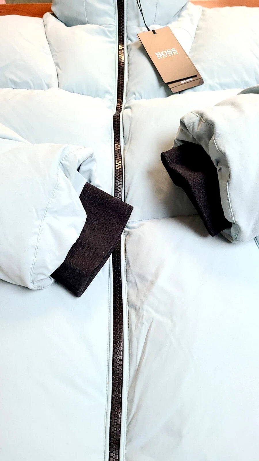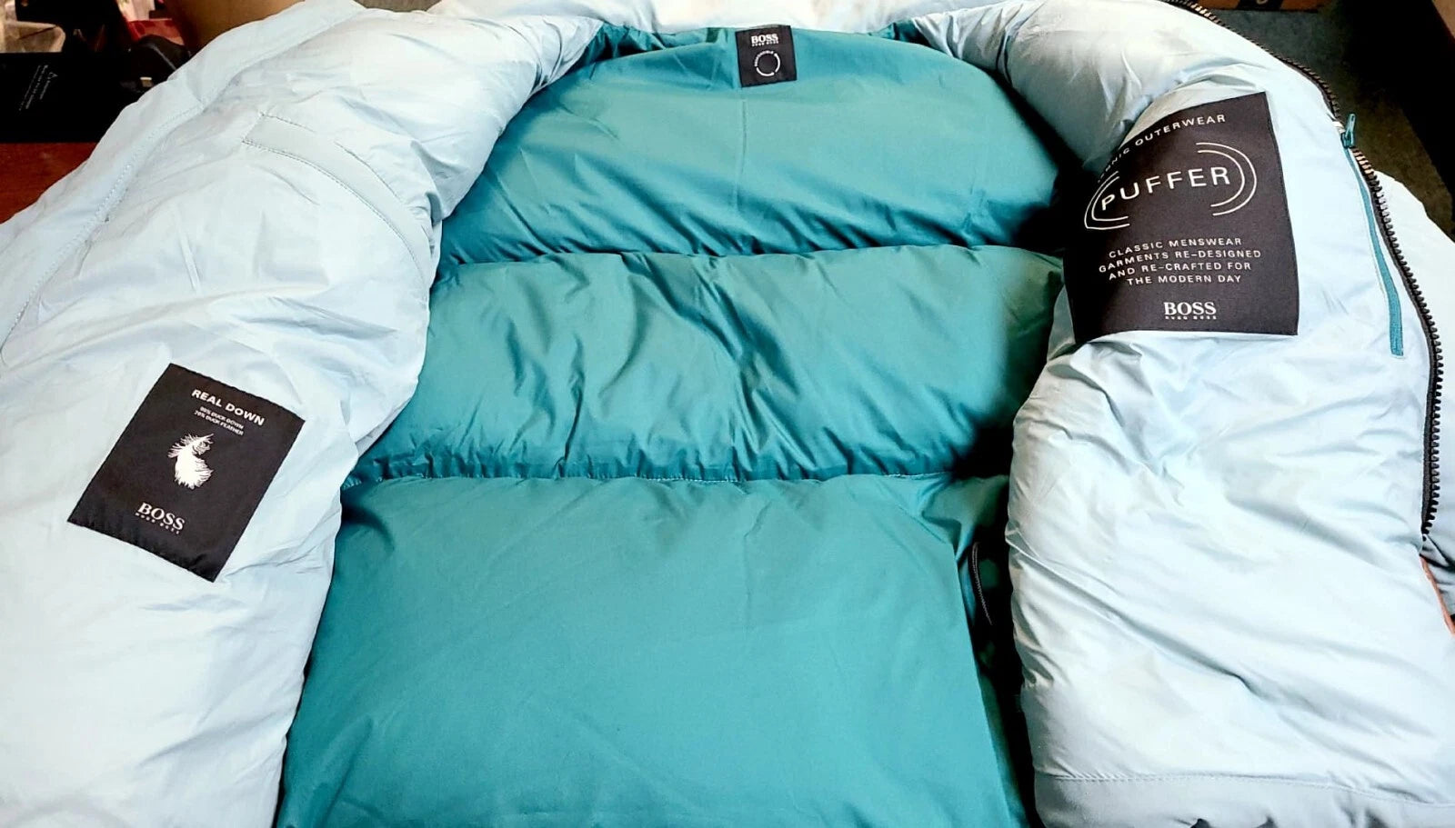 hugo boss, real down puffer iconic jacket, logo, size 38r, teal, polyester, heated, padded, thermal, windproof, wind-resistant, zipped pockets, zip, stand-up, business, casual, formal, travel, workwear