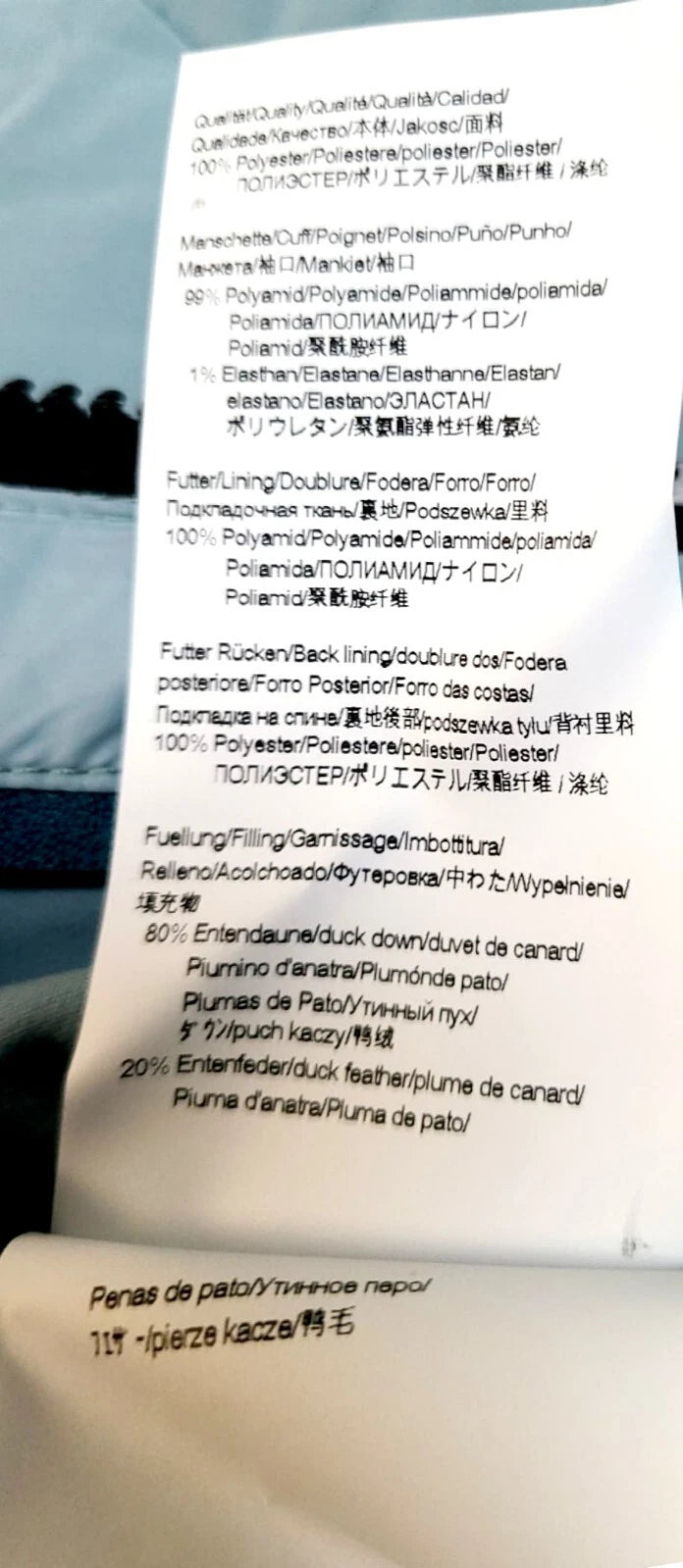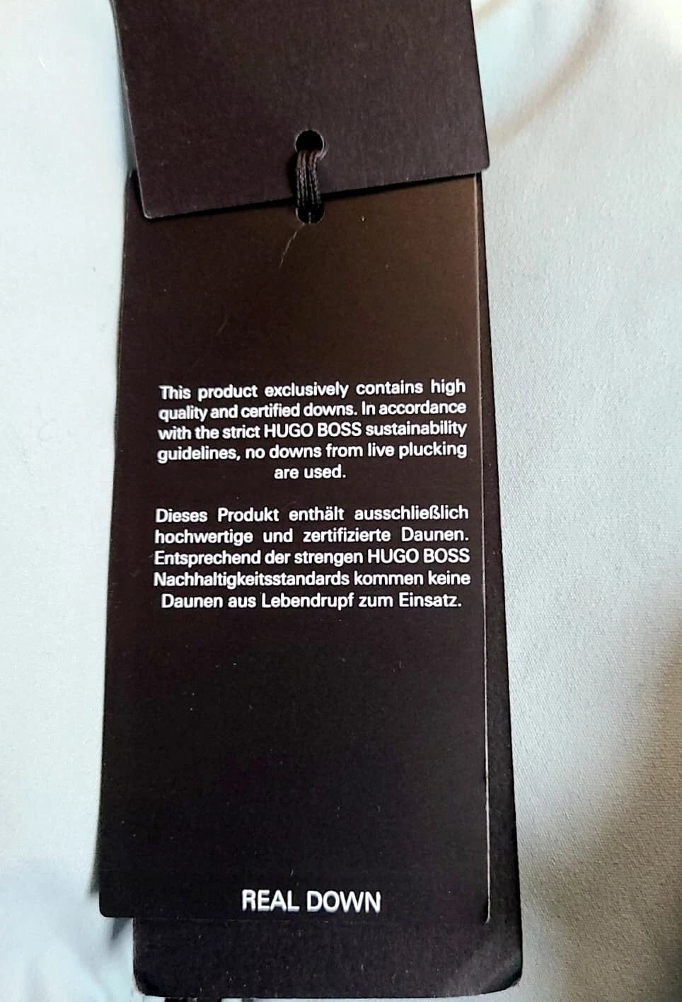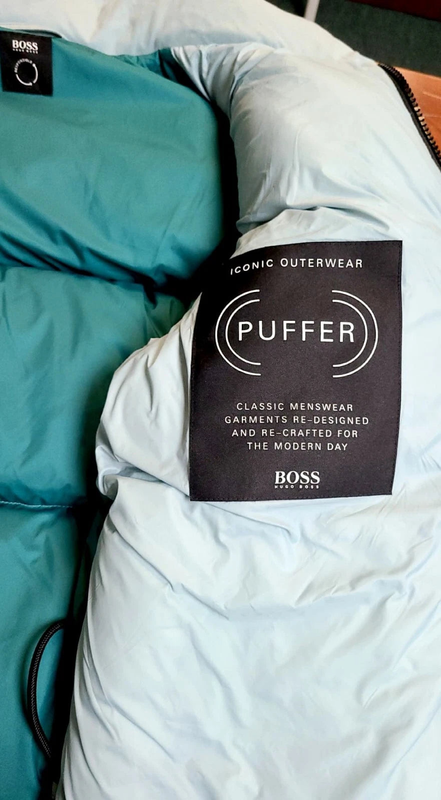 hugo boss, real down puffer iconic jacket, logo, size 38r, teal, polyester, heated, padded, thermal, windproof, wind-resistant, zipped pockets, zip, stand-up, business, casual, formal, travel, workwear