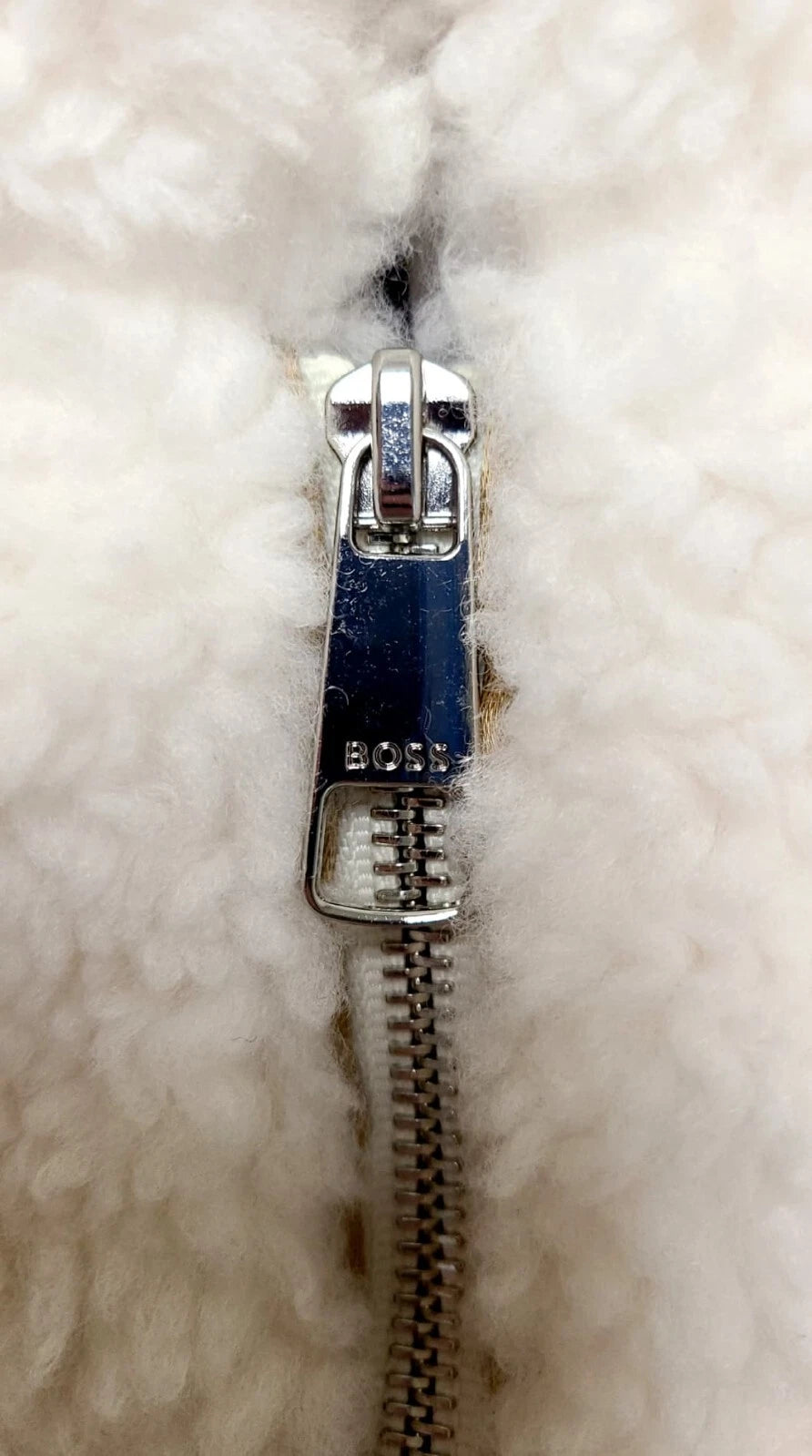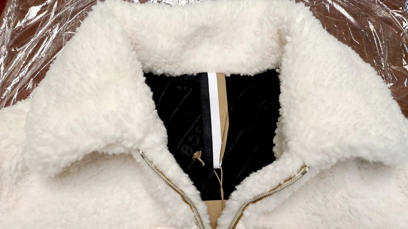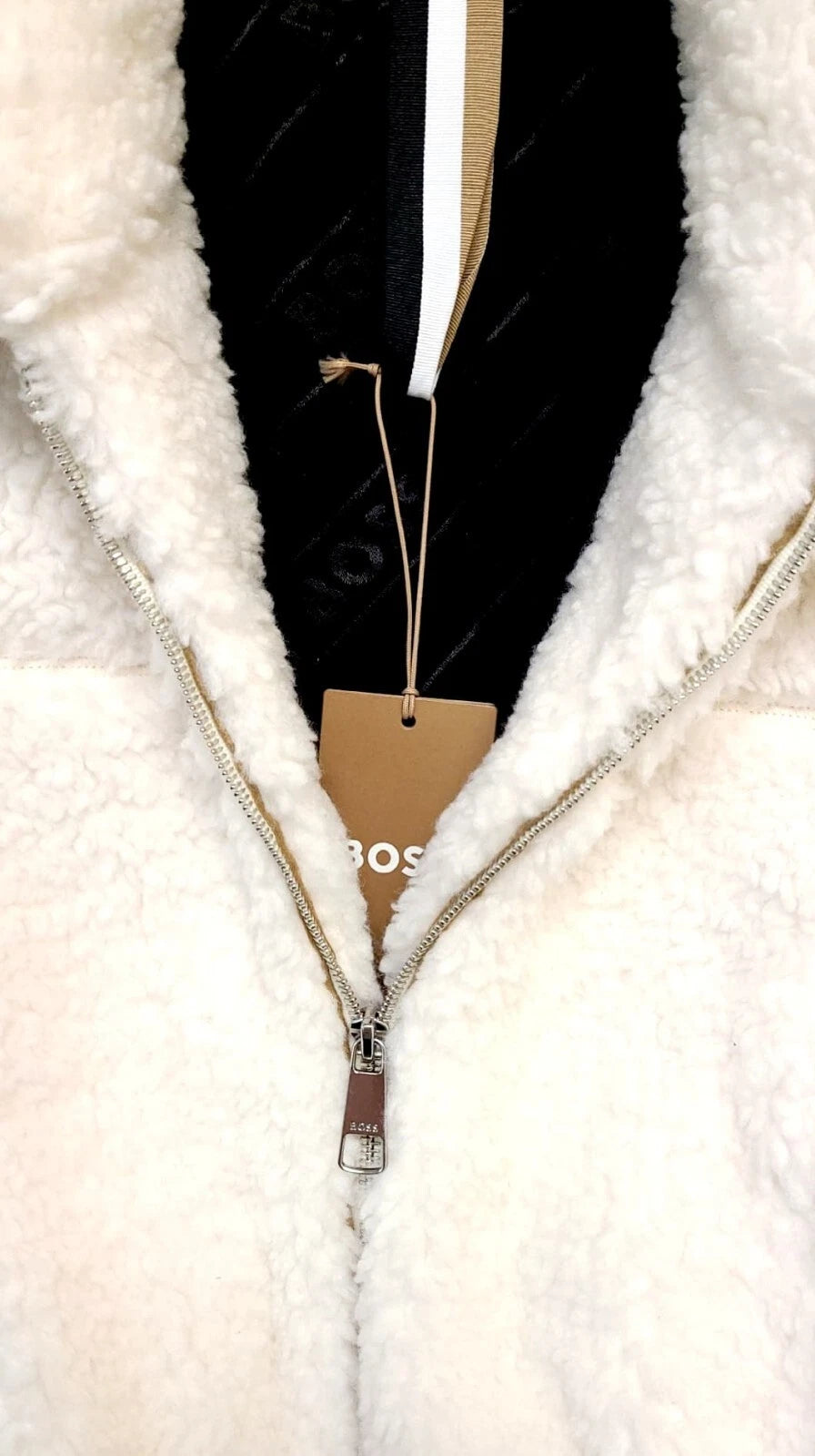 Jatedy Bomber Jacket by Boss Women. A soft shearling construction designed with a central zip fastening and large fold collar. Decorated with contrast striped cuffs, the Boss branding completes the look. Straight cut, turn-down collar, closed with two-way zip, side welt pockets with press studs, ribbed cuffs with stripes on sleeve ends and hem, smooth lining, 100% Polyester.
