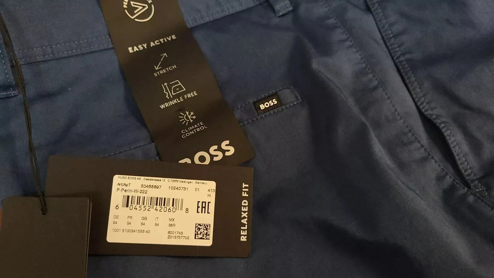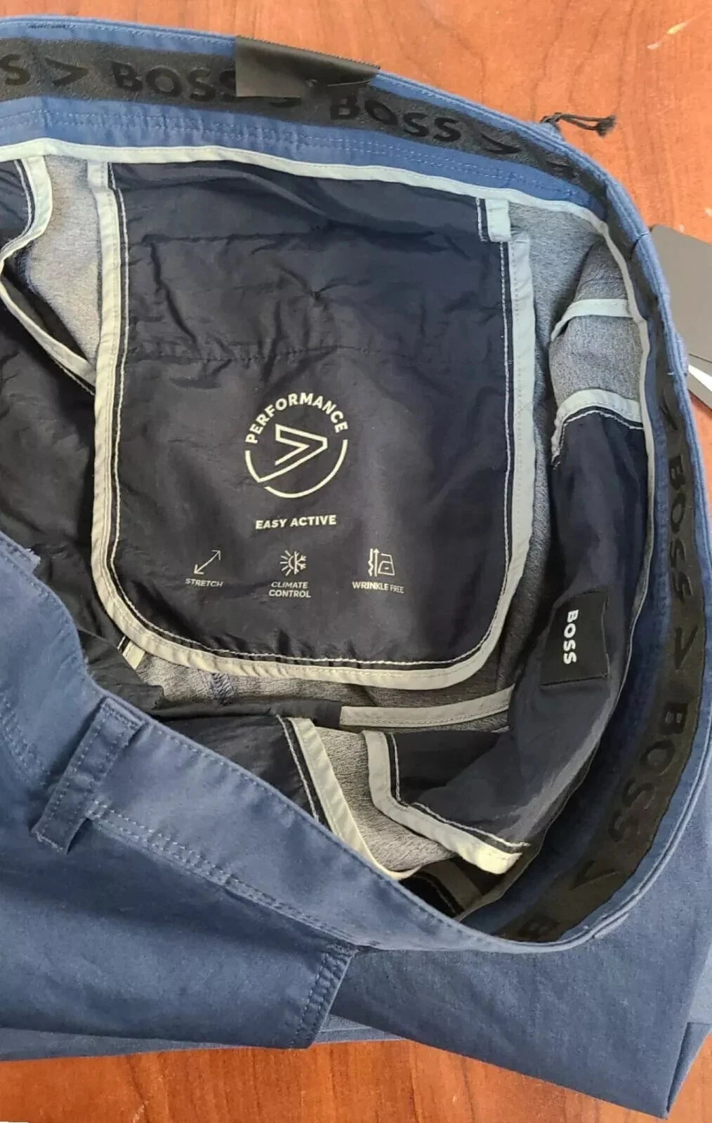 BOSS, BOSS Performance Pants, Easy Active, Stretch, Wrinkle Free, Relaxed Fit, Casual, Pants, Men, 38, Blue, Knit, Cotton, Polyamide, Polyester, Elastane, Breathable, Comfort, Easy Care, Stretch, Wrinkle Resistant, Button, Zipper, Flat Front, Straight, Mid Rise, 32 in, 5-Pocket Design, Machine Washable, Bulgaria, Fall, Spring, Summer, Winter