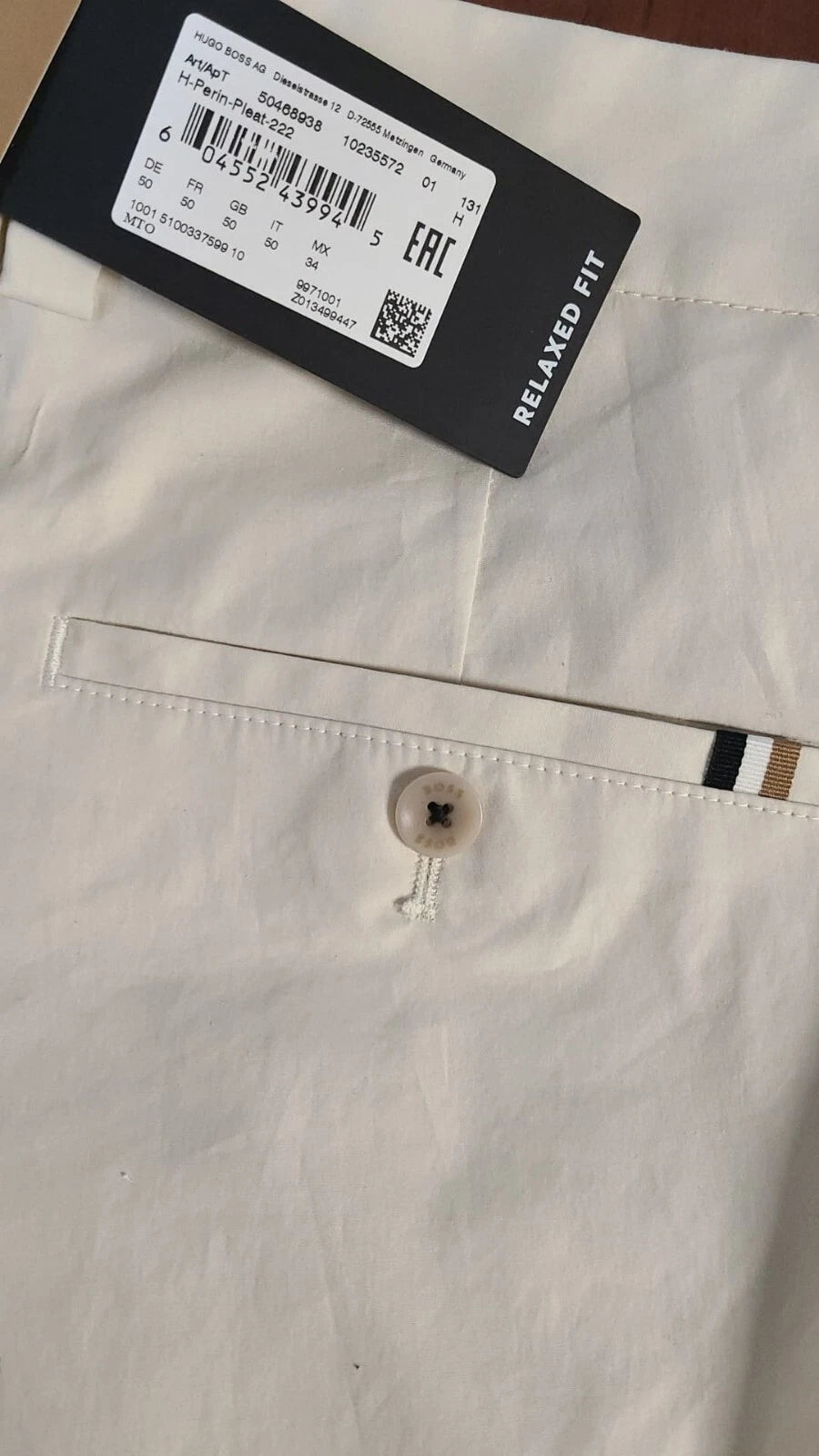 These BOSS Perin Casual Pleat Front Pants in Stretch Cotton are crafted in Germany from premium cotton with added stretch. Designed in a relaxed fit with a straight leg and mid-rise waist, they feature button and zipper accents with a pleat front design. Perfect for business, formal, or casual occasions, these pants combine sophistication with comfort.