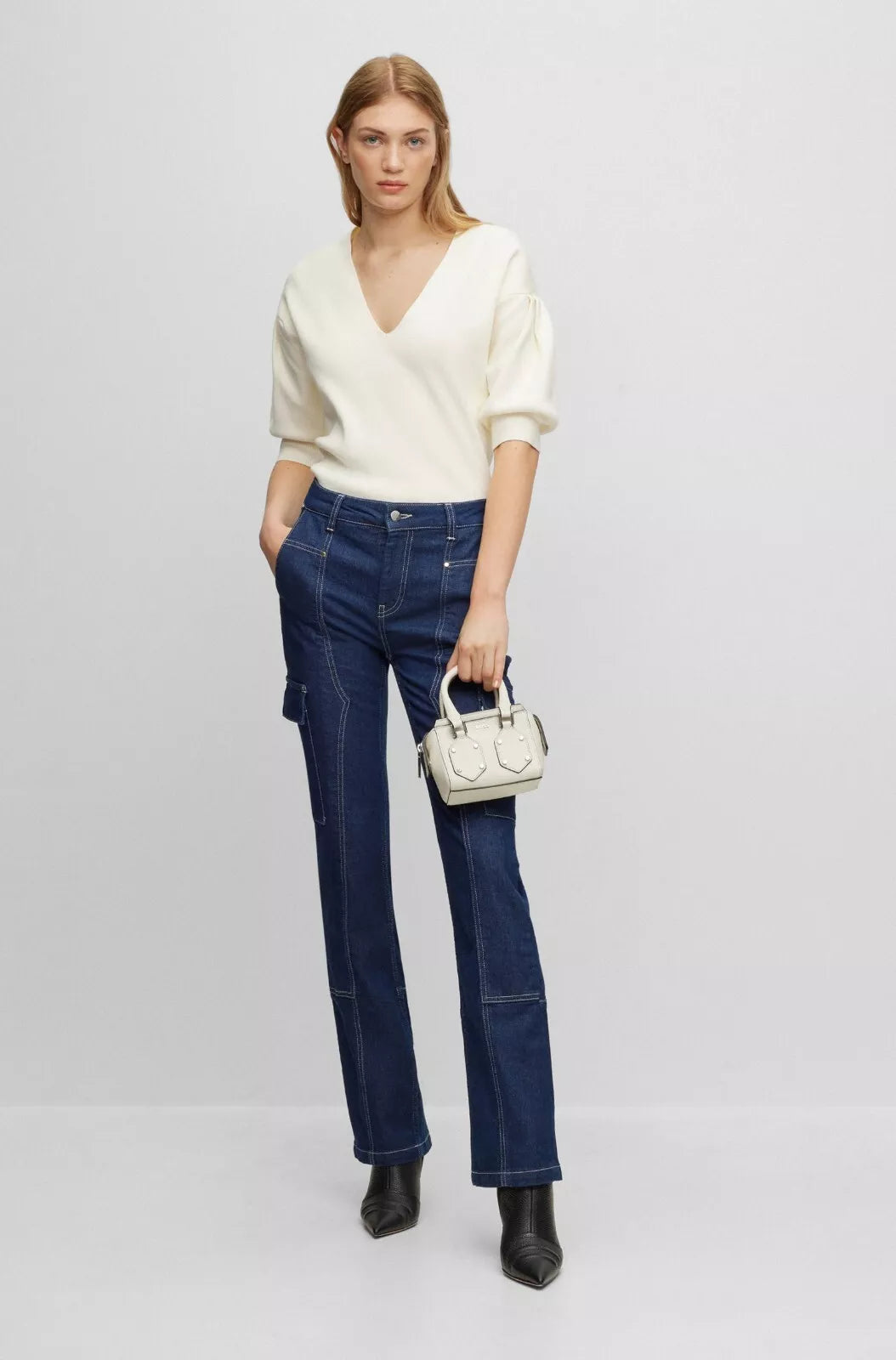 SEO Keywords: BOSS Pullover Sweater, Women's White Sweater, Knit Sweater, V-Neck Sweater, Long Sleeve Sweater, Designer Sweater, BOSS Women's Fashion.