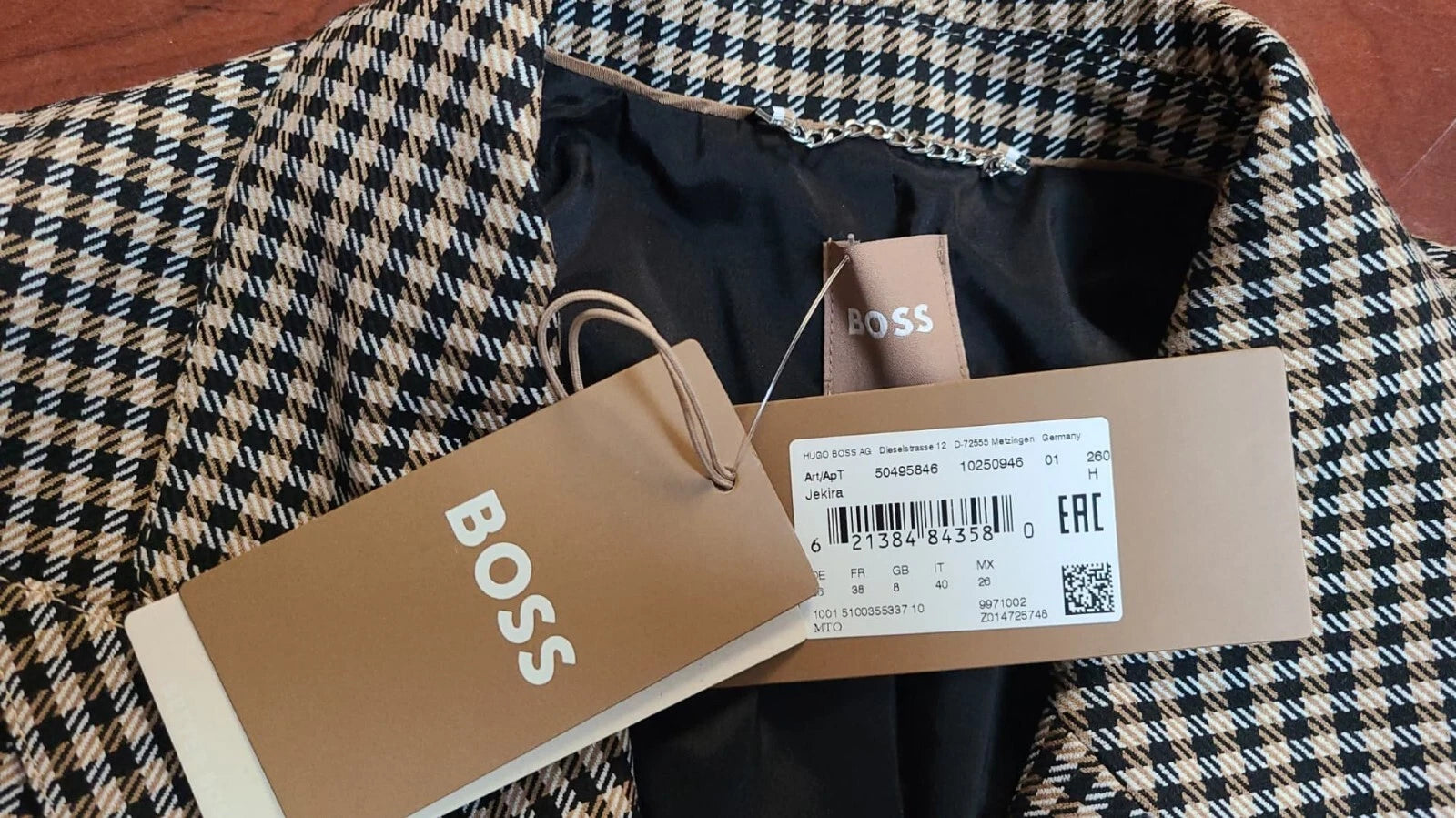 Genuine HUGO BOSS - BOSS DOUBLE BREASTED JACKET IN HOUNDSTOOTH STRETCH CLOTHSize - 4 / 26BeigeImportedJekira - 50495846A masculine jacket by BOSS Womenswear cut to a relaxed fit in houndstooth fabric featuring peak lapels and a double-breasted closure.Relaxed fitReverse lapelsButton closure4 or more buttonsWelt chest pocketsPockets top: Jetted pocketsButton cuffsBack ventFully linedFit back length: 74 cm (29 inches)68% Polyester, 28% Viscose, 4% ElastanePlease see pictures for more detailsCheck Out My Other EBAY Items You May EnjoyThank you