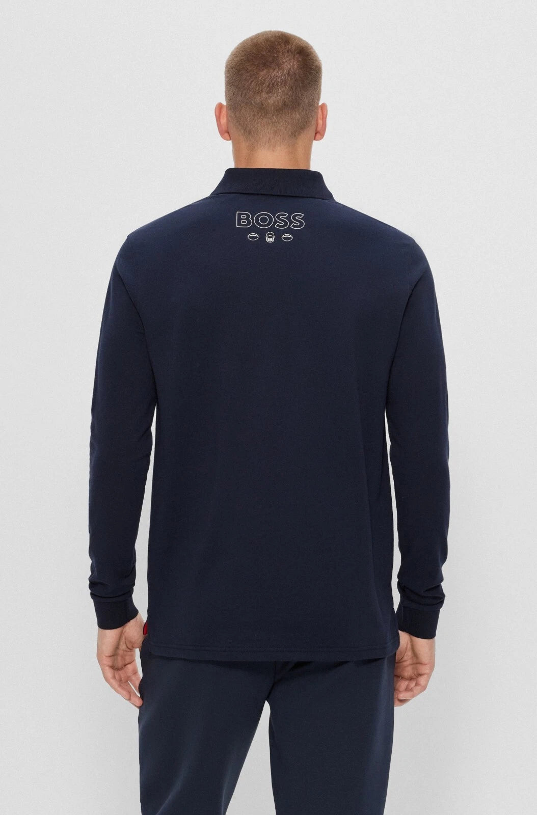 SEO Keywords: HUGO BOSS x NFL Polo, Men's Long-Sleeved Polo, Dark Blue Polo Shirt, Cotton Piqué Polo, Embroidered Logo Polo, Designer Polo Shirt, BOSS NFL Collection, Limited-Edition Sportswear.