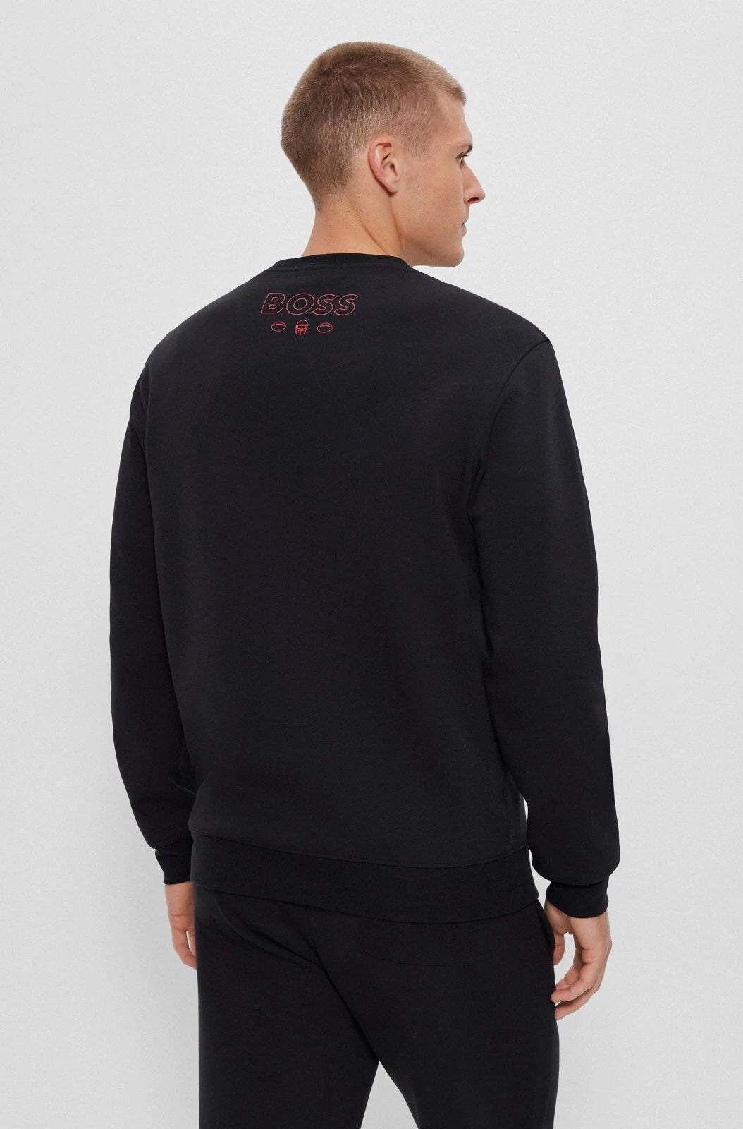 SEO Keywords: HUGO BOSS x NFL Sweatshirt, New York Giants Sweatshirt, Men's Black Crewneck, Cotton Sweatshirt, Graphic Print Sweatshirt, Designer Athleisure, BOSS NFL Collection, Limited-Edition Sportswear.