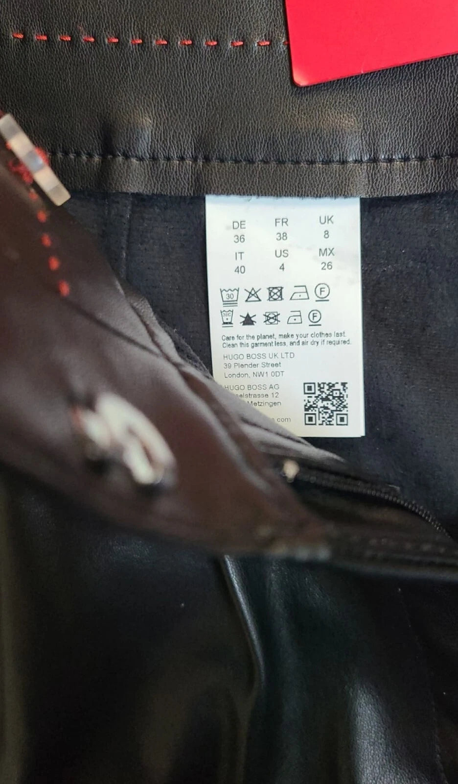 hugo, boss, pants, baggy fit, black, synthetic coated fabric, high rise, hook and zip closure, tapered leg, pleat front, french pocket, welt pocket, unlined, 100% polyester